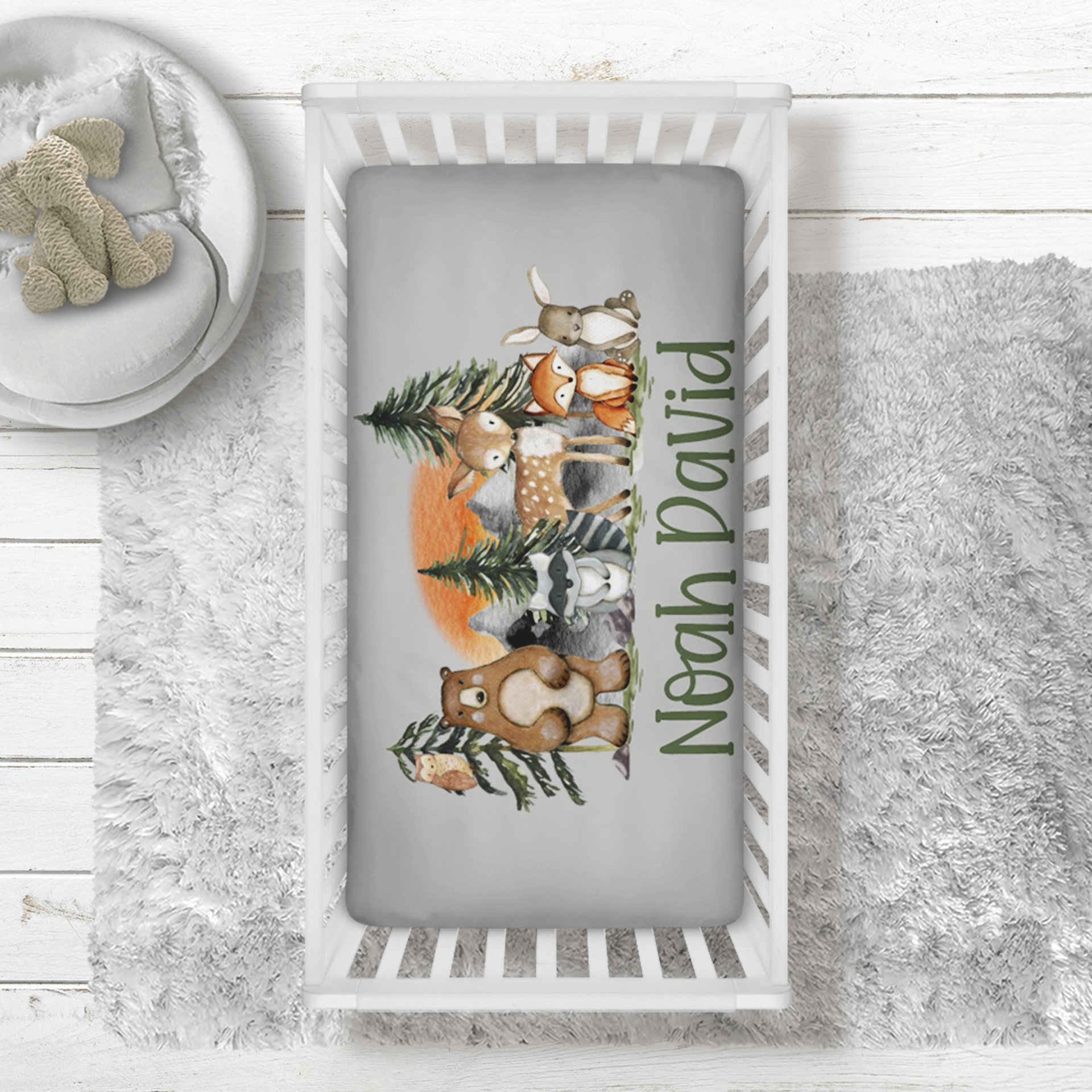 Personalized fitted crib sheet with cute forest animals and your baby's name on it.