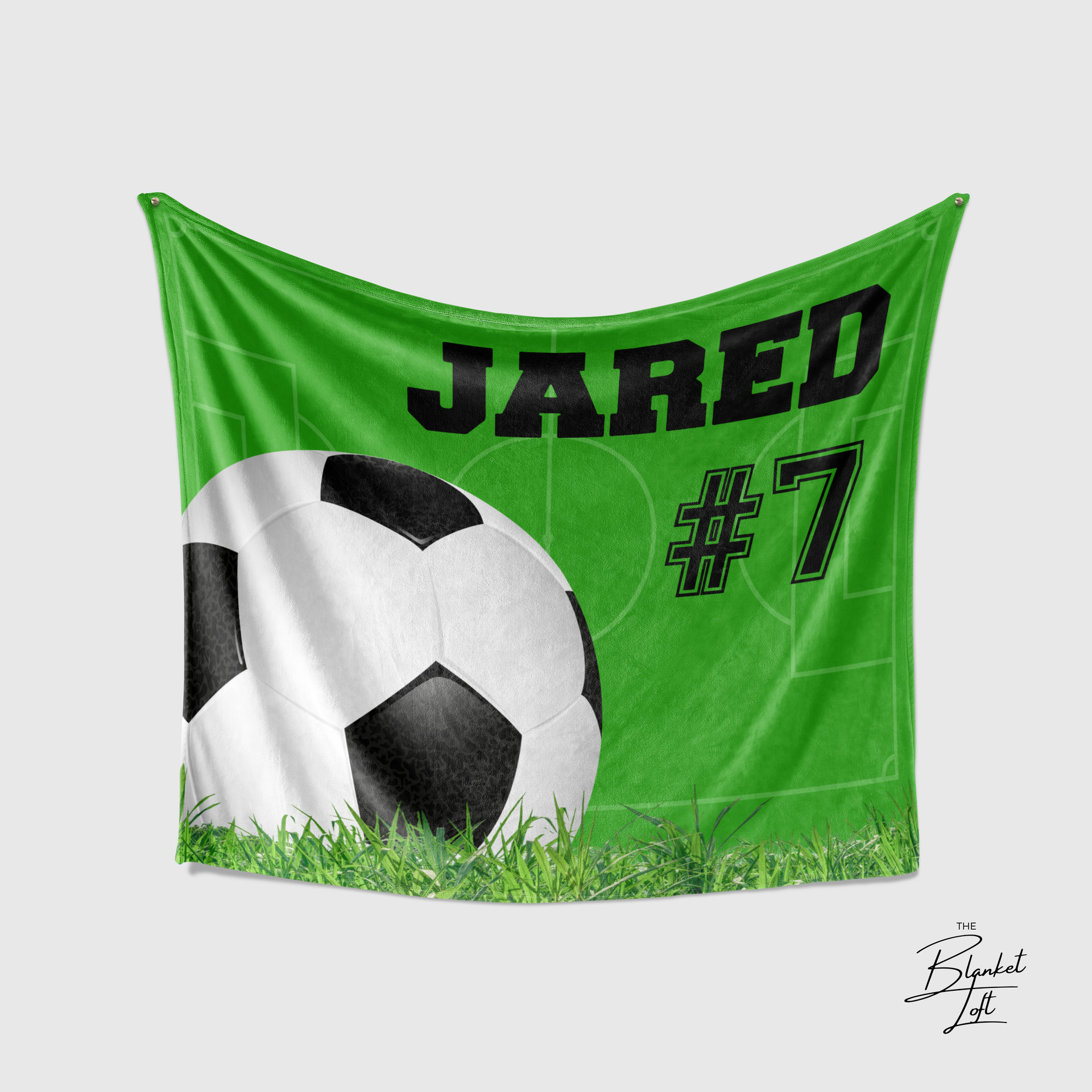 This personalized blanket design has your child's name and optional number with a soccer theme.