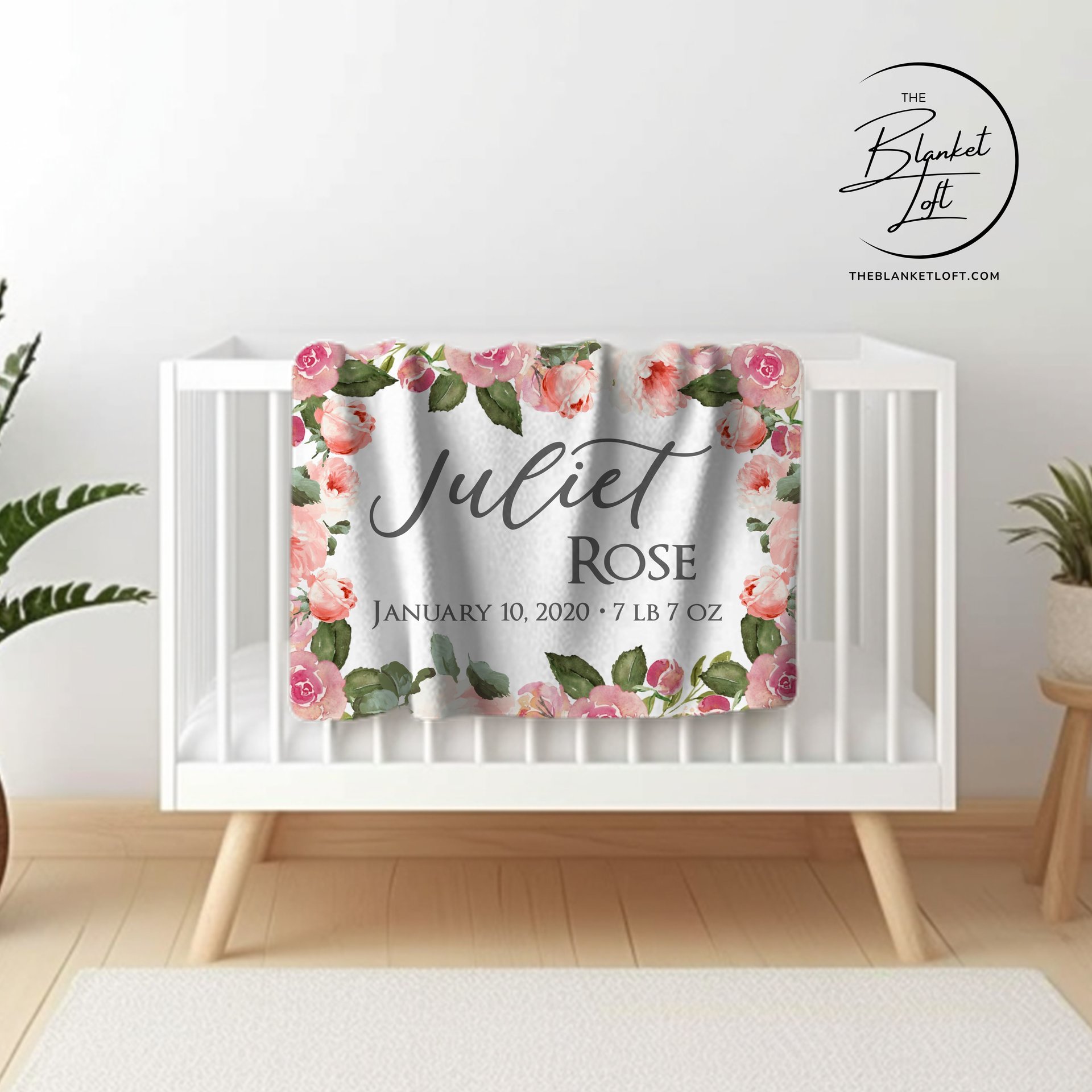 This personalized baby blanket has a pretty floral theme and your child's name and birth stats on it.