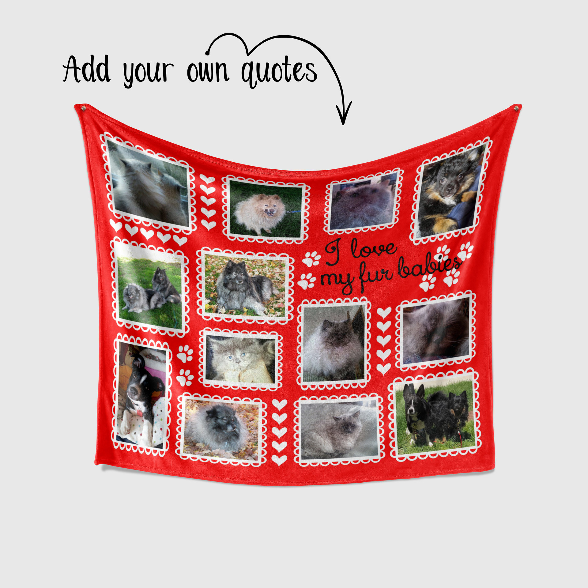 This personalized photo blanket design shows a photo collage with multiple photos and a quote about pets.