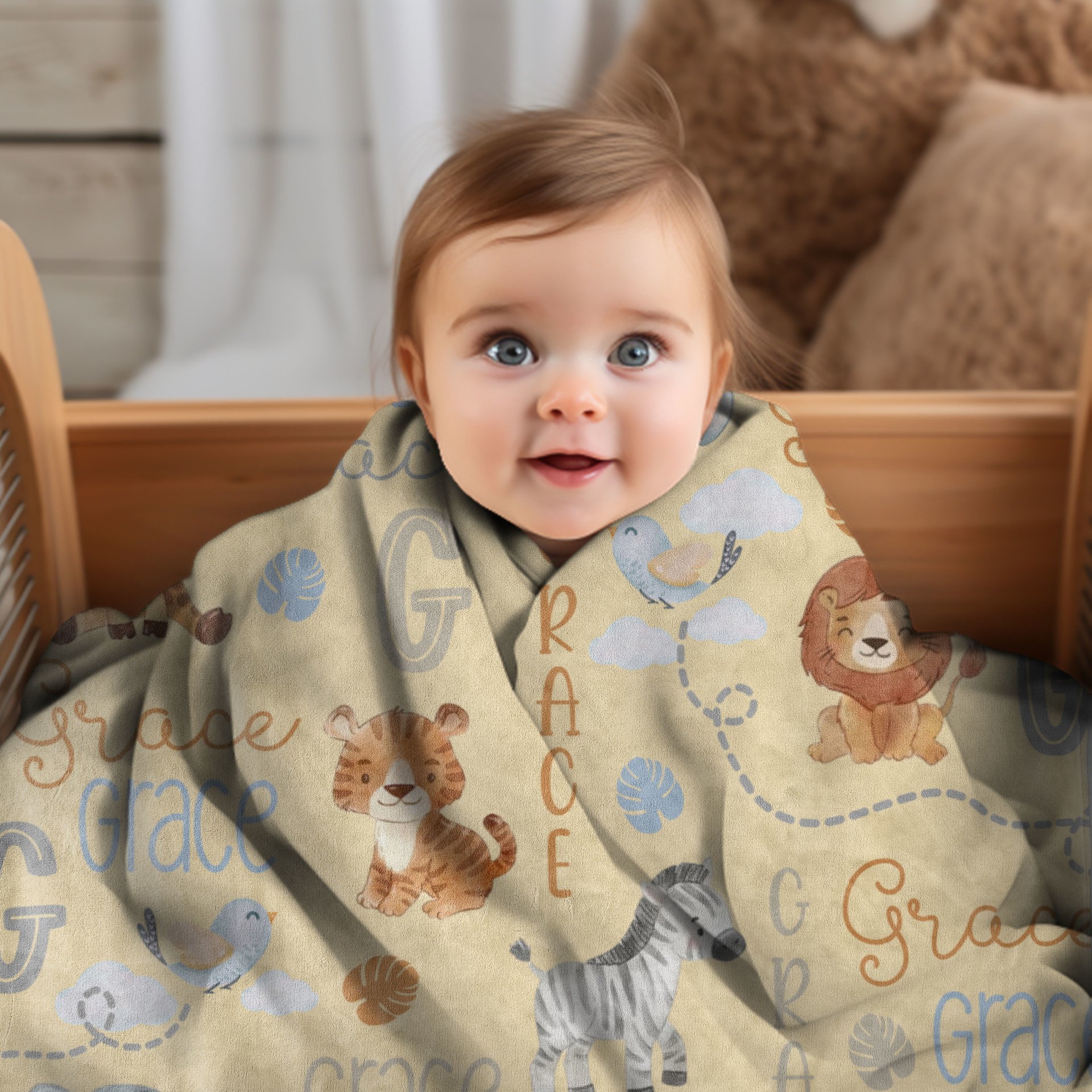 This personalized baby blanket has cute safari animals and your child's name all over it