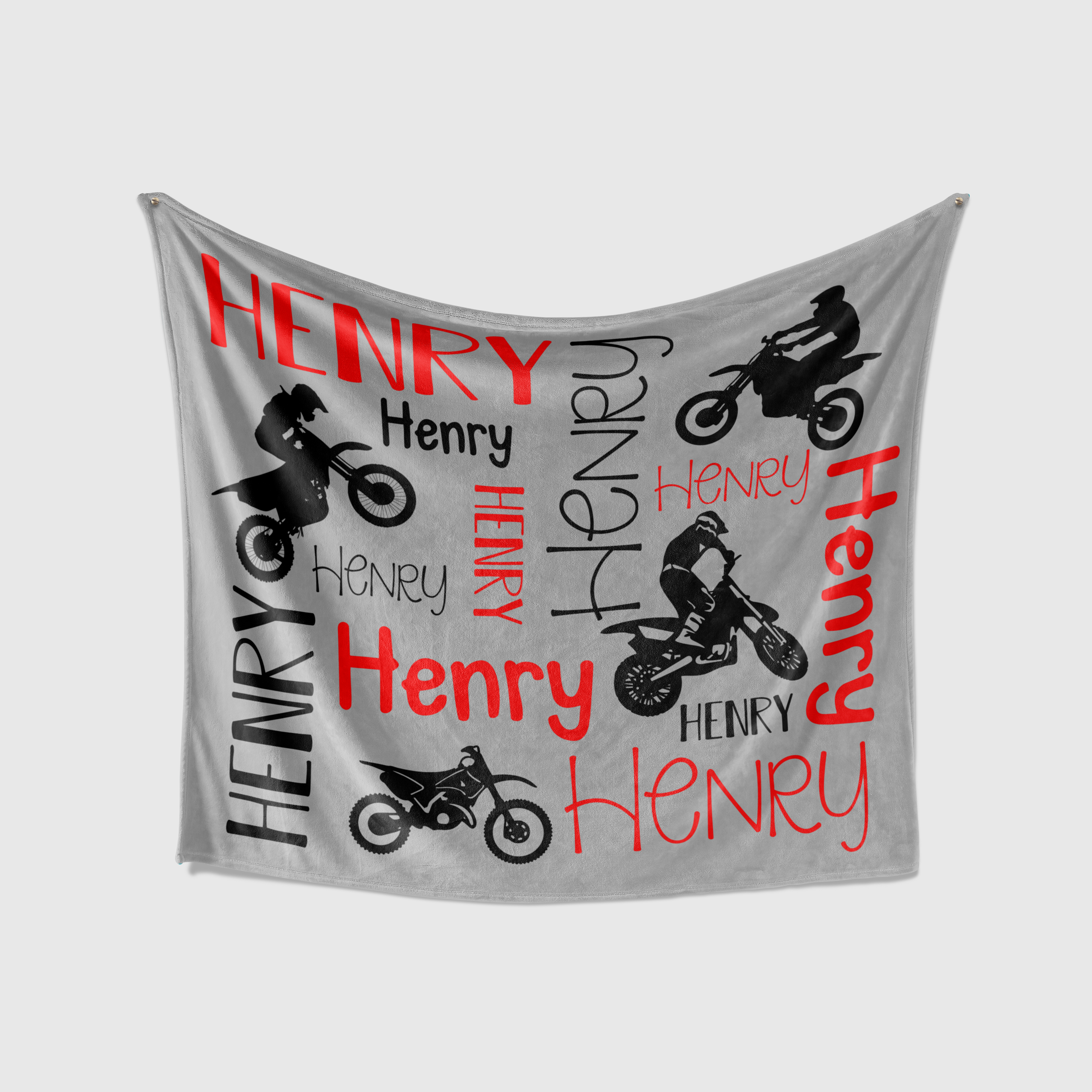 This personalized baby blanket has dirt bikes and your child's name all over it.