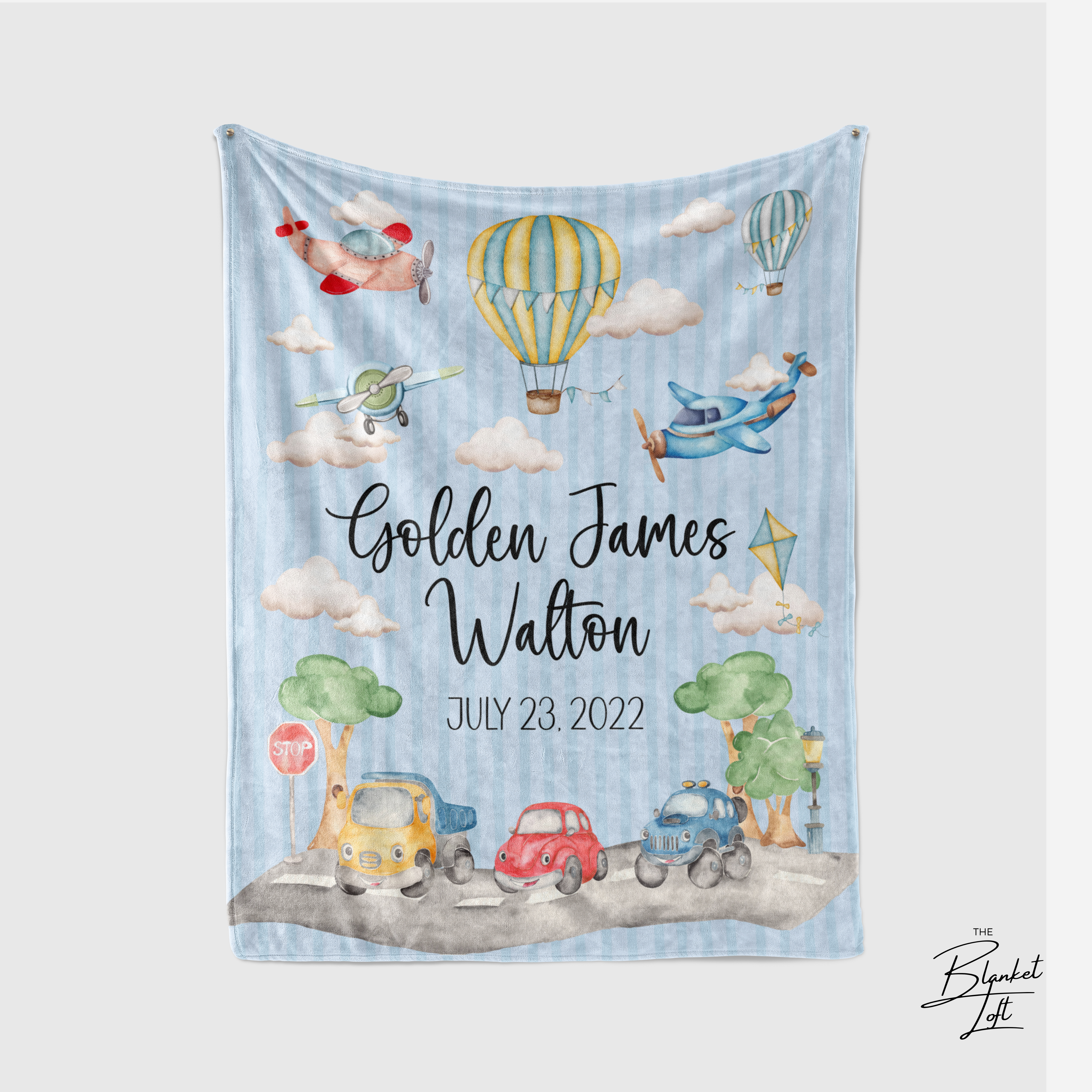 This personalized baby blanket has cute cars and planes and your child's name on it