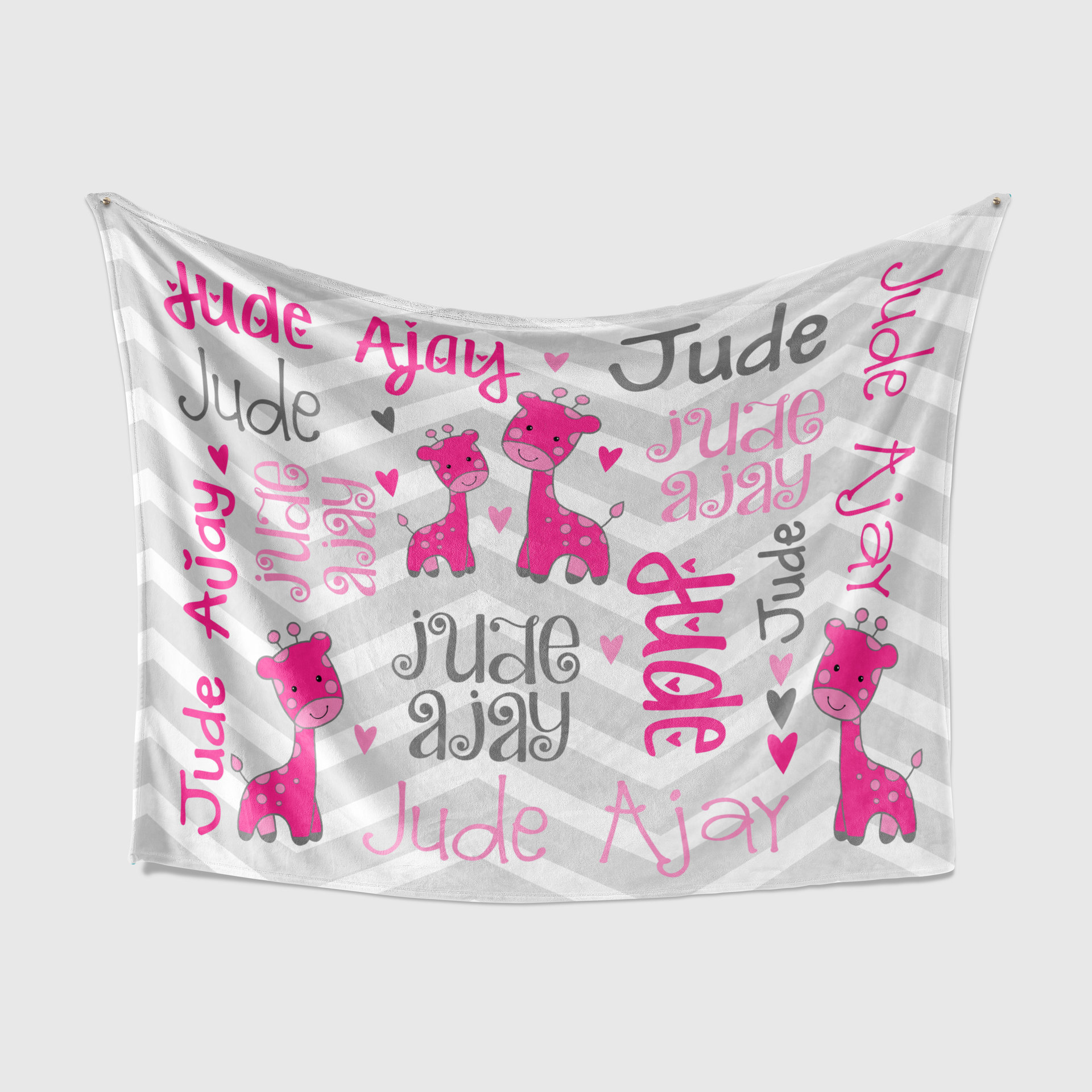 This personalized baby blanket has a cute giraffe theme and your child's name all over it