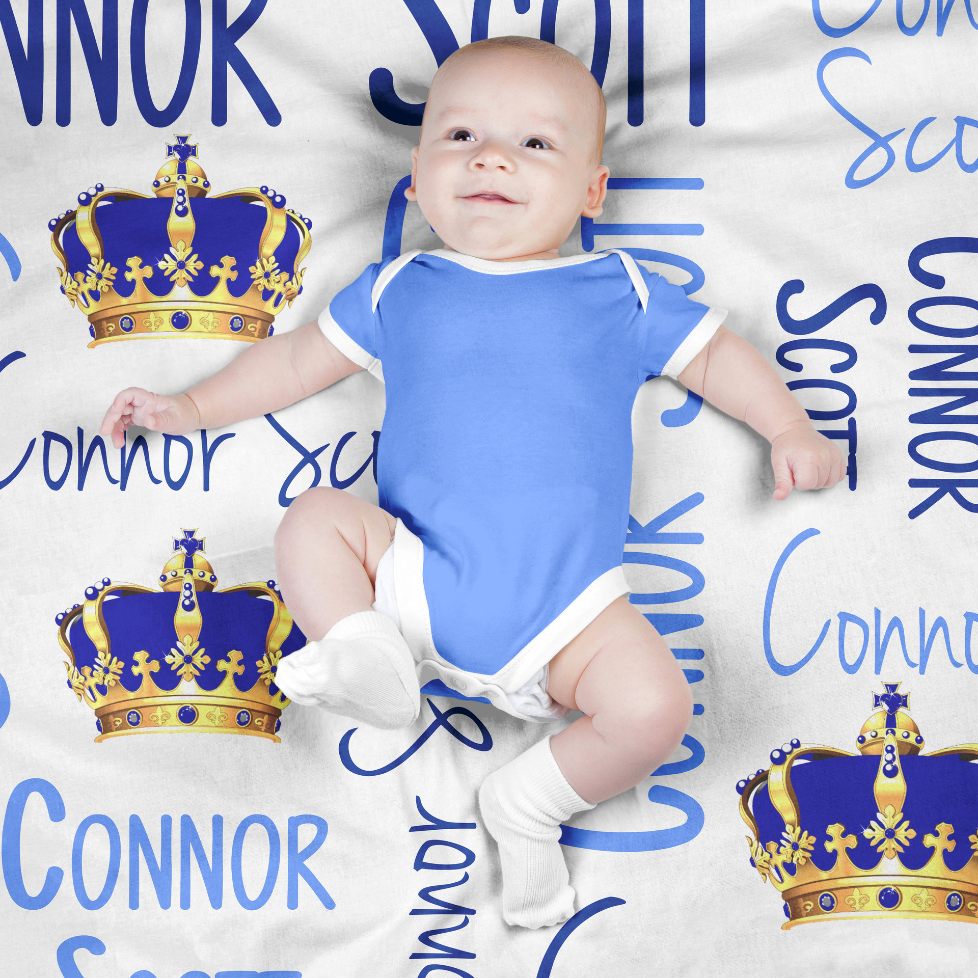 This personalized baby blanket has a royal prince theme and your child's name on it.