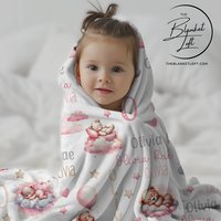 This personalized baby blanket has a cute sleeping teddy bears theme and your child's name all over it.