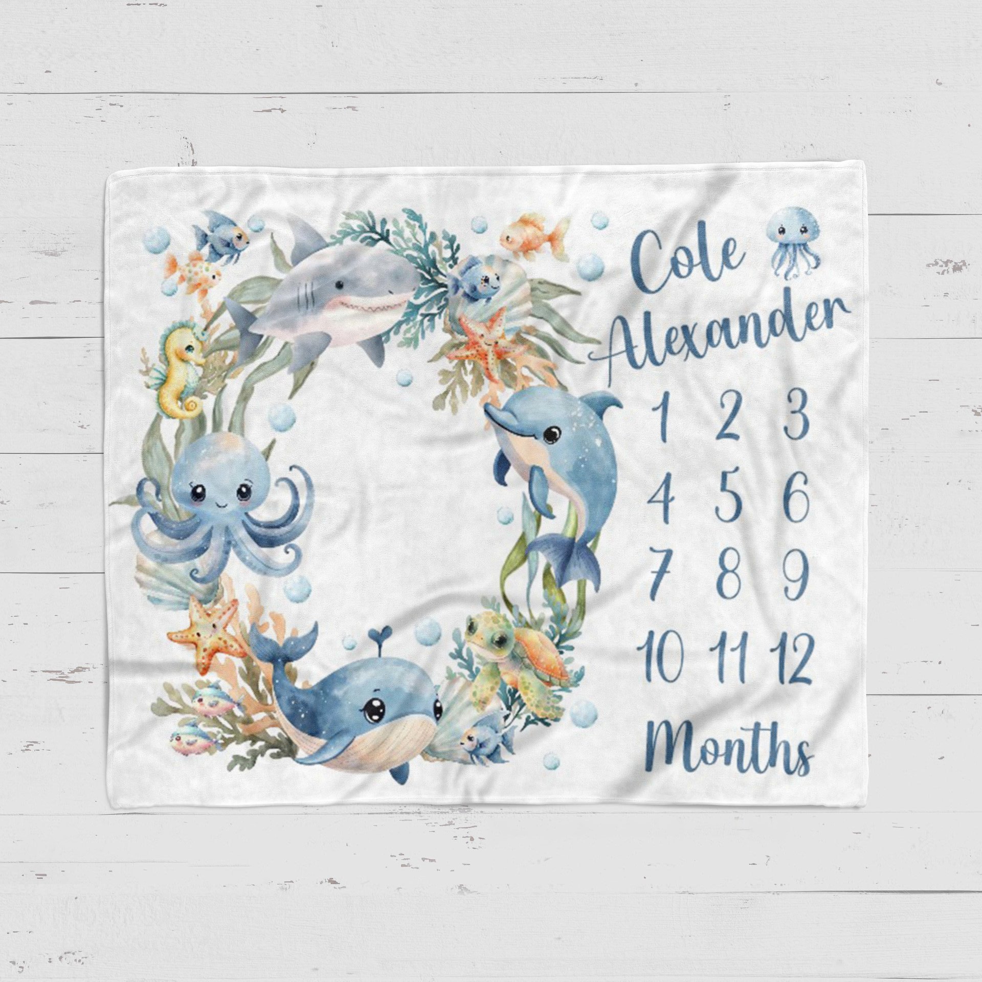 This personalized monthly milestone blanket design is a personalized photo prop blanket for taking each month’s picture of your new baby! Place frame on the month to show how old your baby is, and lay your baby on the blank spot of the personalized monthly milestone blanket. These will be adorable photos that will show the progression of your baby during their first year!
